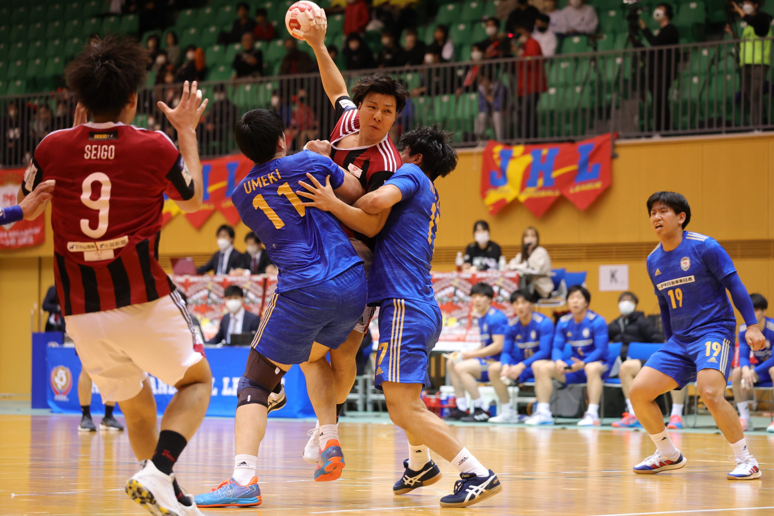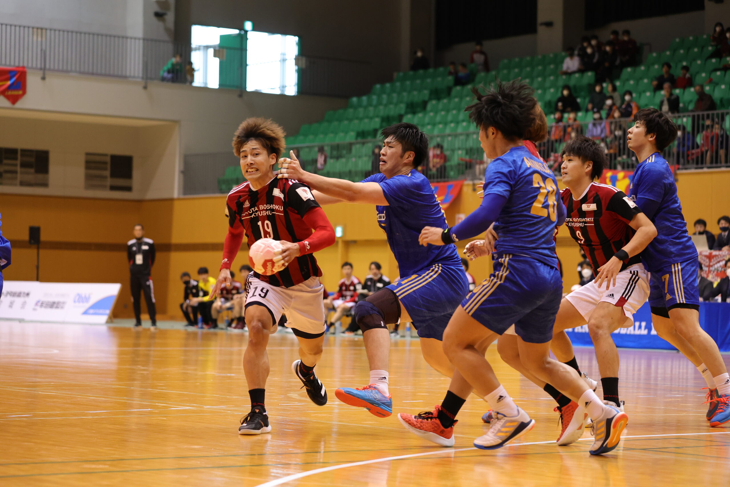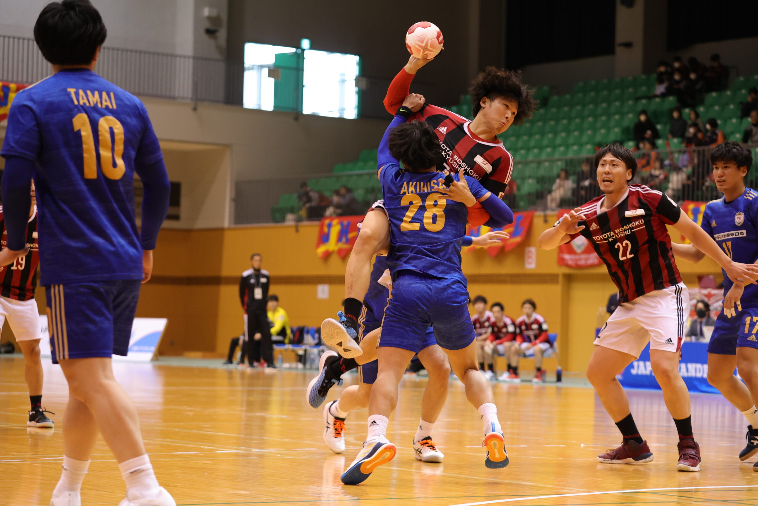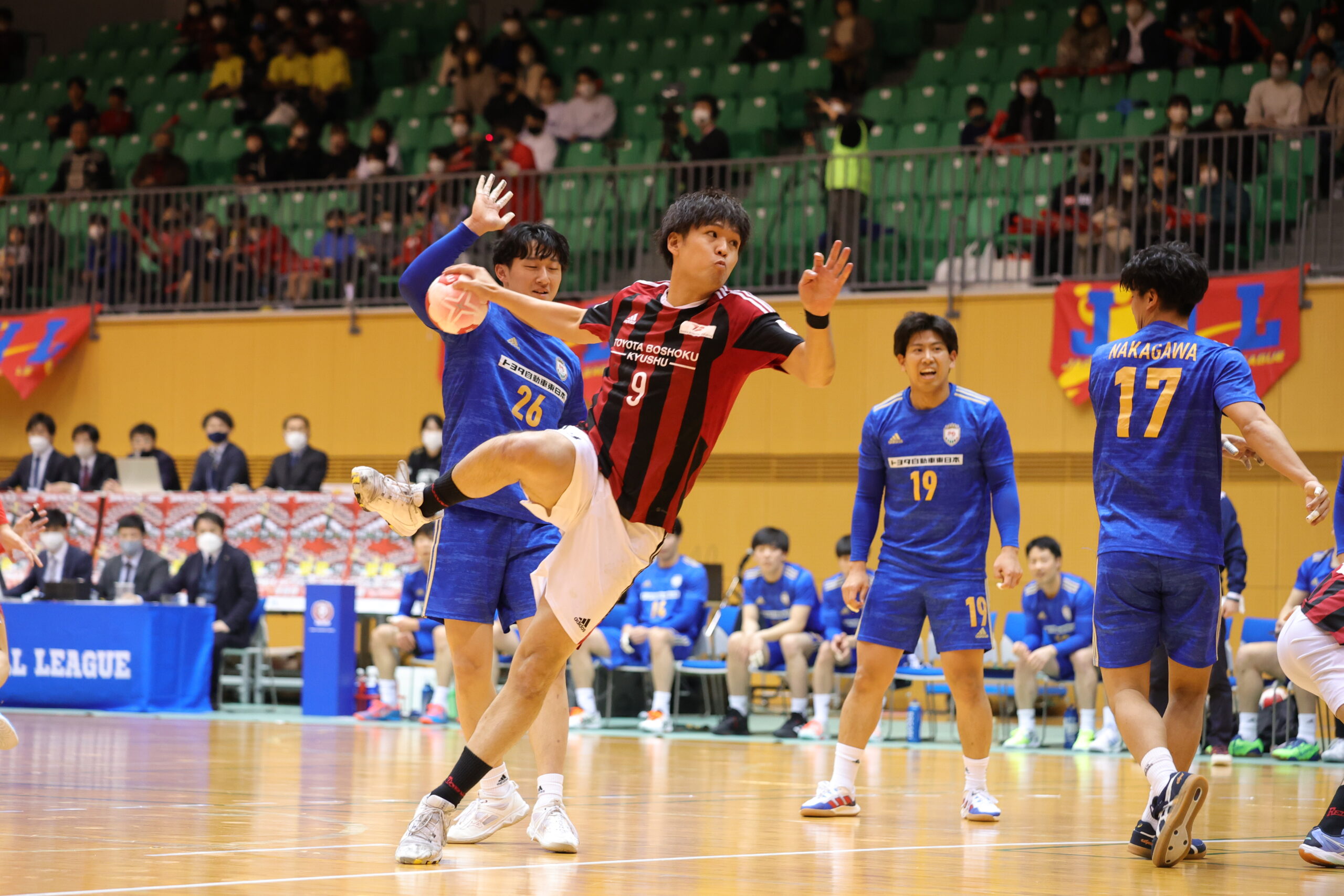 紡織No.八巻のゴールでゲームが動き出す。開始5分間、紡織は東日本の7人攻撃を守りエンプティゴールを含め3連取。東日本もNo.14佐藤のゴールで応戦。両チーム高い2枚目ディフェンスで守って速攻が続く。紡織は前半3回もの退場者を出すが守護神No.12岩下がオリンピック代表のプライドでゴールを死守。東日本は足が動き出した「攻めるディフェンス」で相手のミスを誘い、連取で逆転。28分30秒に同点に追いつき29分10秒には逆転。12対13東日本リードで前半折り返す。