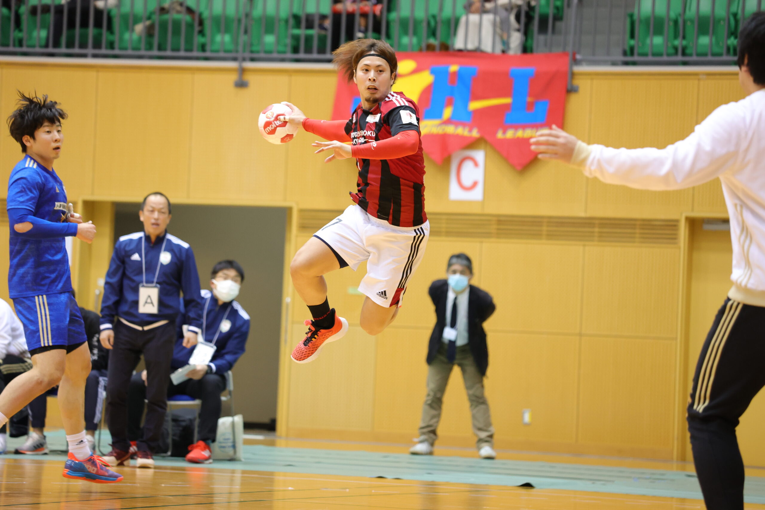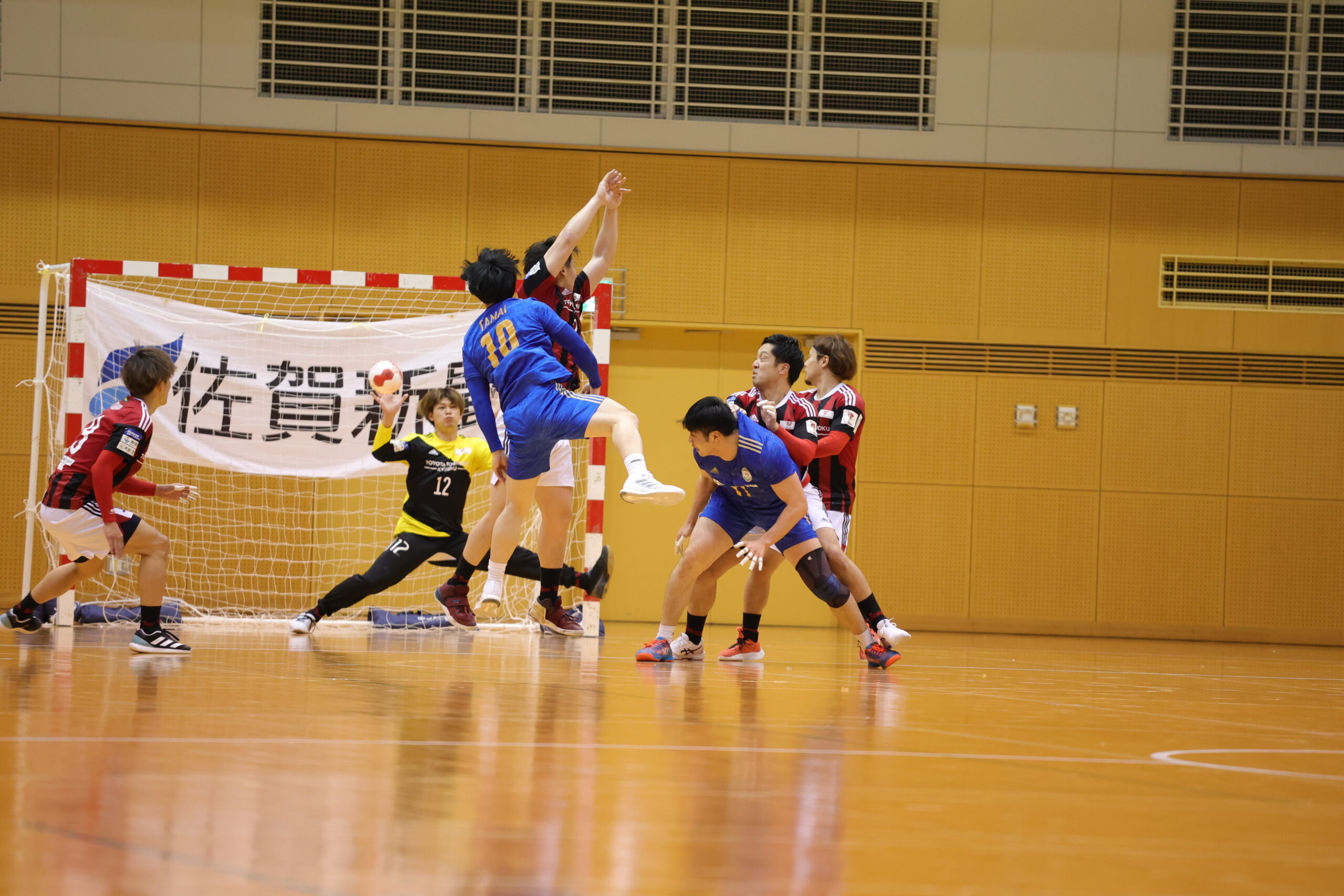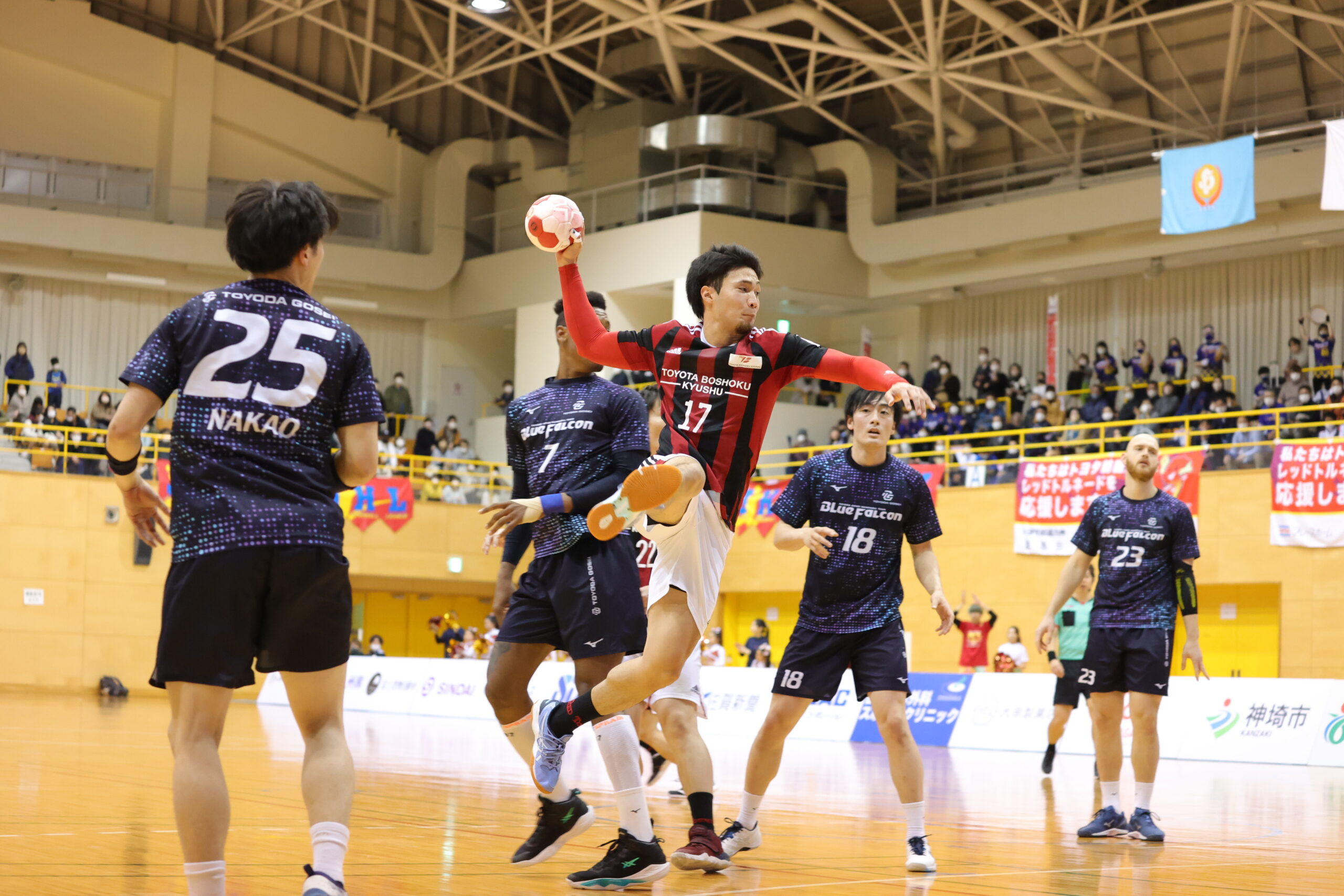 紡織No.八巻のゴールでゲームが動き出す。開始5分間、紡織は東日本の7人攻撃を守りエンプティゴールを含め3連取。東日本もNo.14佐藤のゴールで応戦。両チーム高い2枚目ディフェンスで守って速攻が続く。紡織は前半3回もの退場者を出すが守護神No.12岩下がオリンピック代表のプライドでゴールを死守。東日本は足が動き出した「攻めるディフェンス」で相手のミスを誘い、連取で逆転。28分30秒に同点に追いつき29分10秒には逆転。12対13東日本リードで前半折り返す。