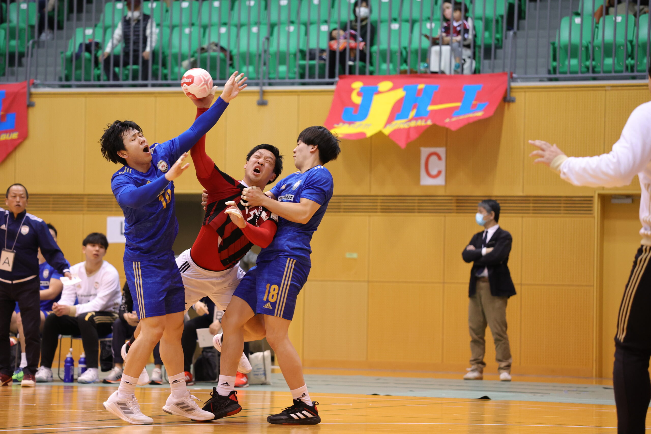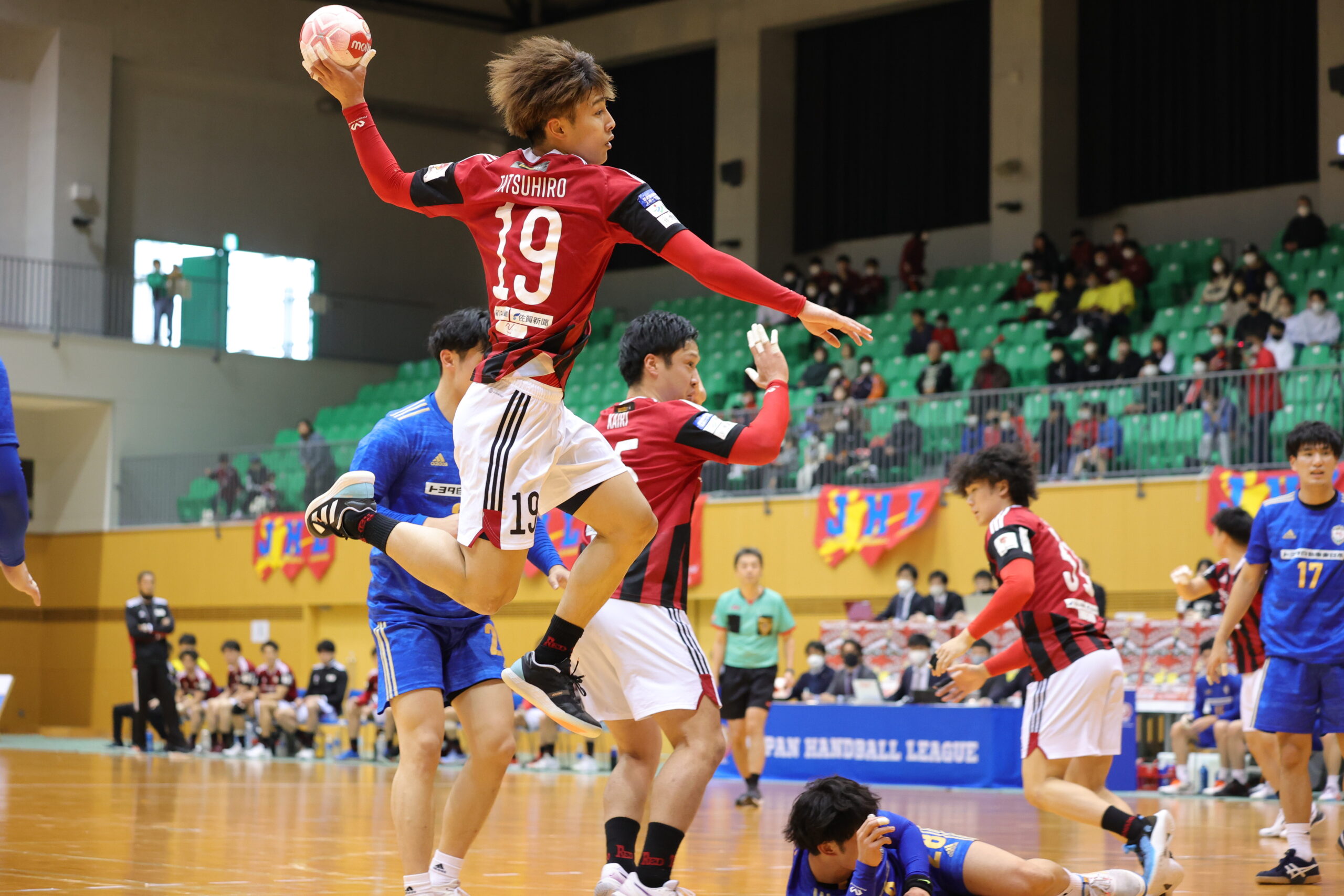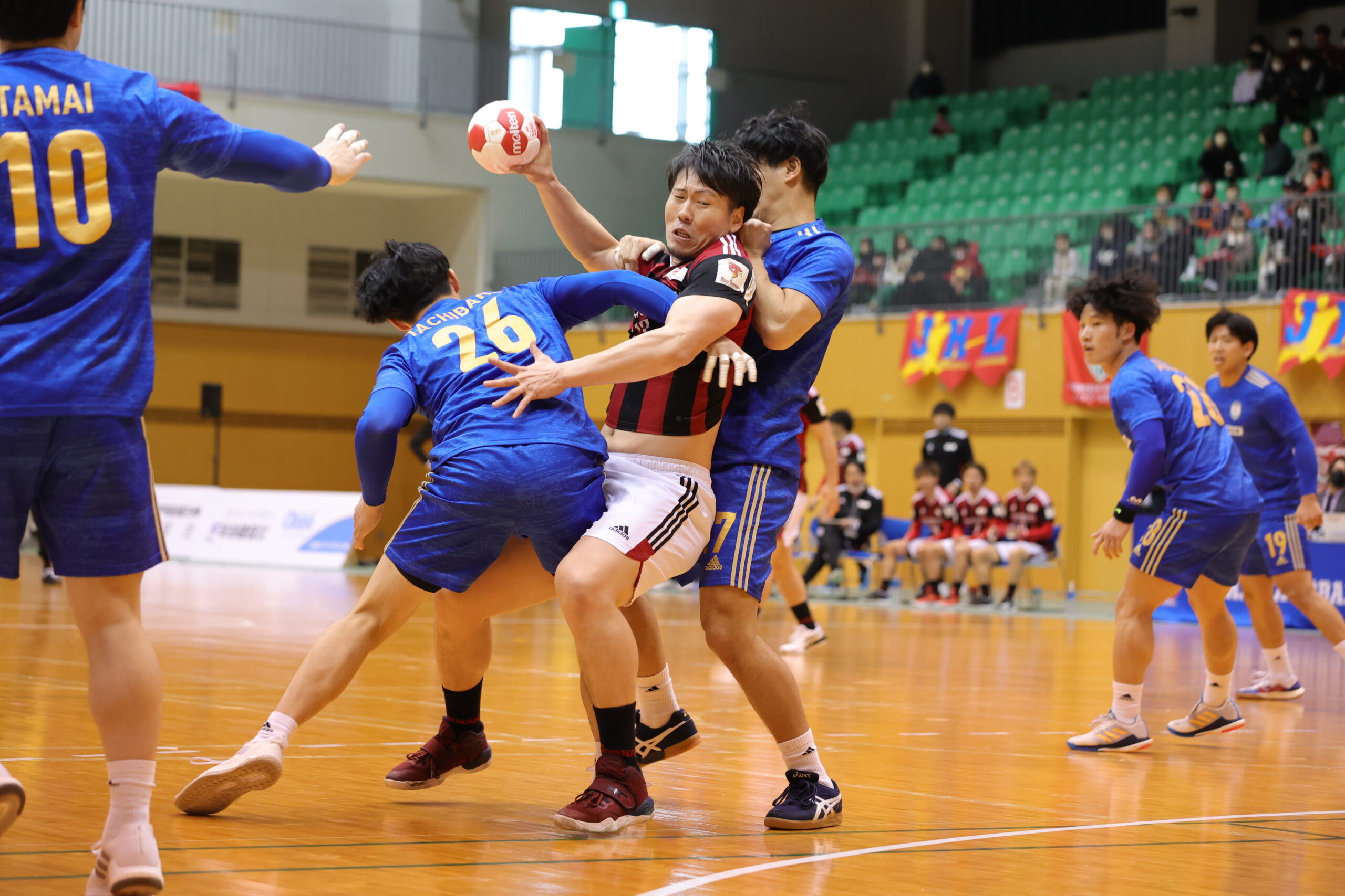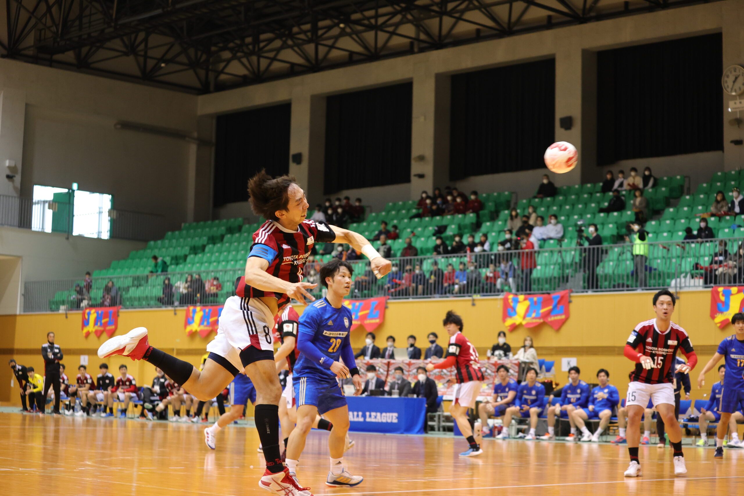 紡織No.八巻のゴールでゲームが動き出す。開始5分間、紡織は東日本の7人攻撃を守りエンプティゴールを含め3連取。東日本もNo.14佐藤のゴールで応戦。両チーム高い2枚目ディフェンスで守って速攻が続く。紡織は前半3回もの退場者を出すが守護神No.12岩下がオリンピック代表のプライドでゴールを死守。東日本は足が動き出した「攻めるディフェンス」で相手のミスを誘い、連取で逆転。28分30秒に同点に追いつき29分10秒には逆転。12対13東日本リードで前半折り返す。